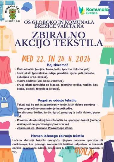 V sodelovanju s Komunalo Brežice na OŠ Globoko izvajamo akcijo zbiranja tekstila. Prosim, da letak posredujete članom in za objavo na spletni strani KS Globoko. Letak je v prilogi.